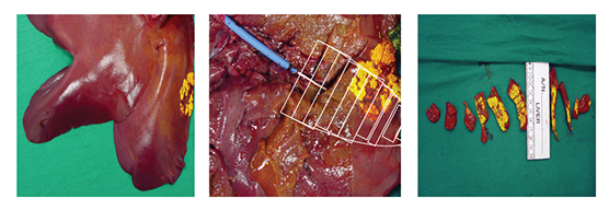 Serum samples were taken from the withÂdrawal syringe, right ventricle, aorta, and femoral vein at 10-minute intervals during and 30-minute intervals after infusion. Yellow tissue-marking dye was infused to mark the distribution of the 30-minute infusion (Figure 2). Blood serum samples and frozen tissue sections from the target liver site, waste, heart, and distal liver sites were analyzed with high-pressure liquid chromatography (HPLC).